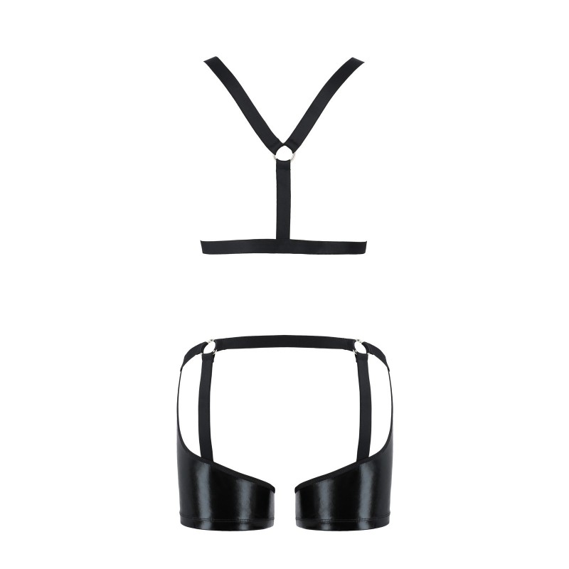 Su diseño sensual y sus materiales cómodos y resistentes hacen de este modelo una excelente elección para todos los hombres atrevidos que buscan sensaciones intensas. La lencería está fabricada en llama negra brillante, combinada con anillas metálicas decorativas.