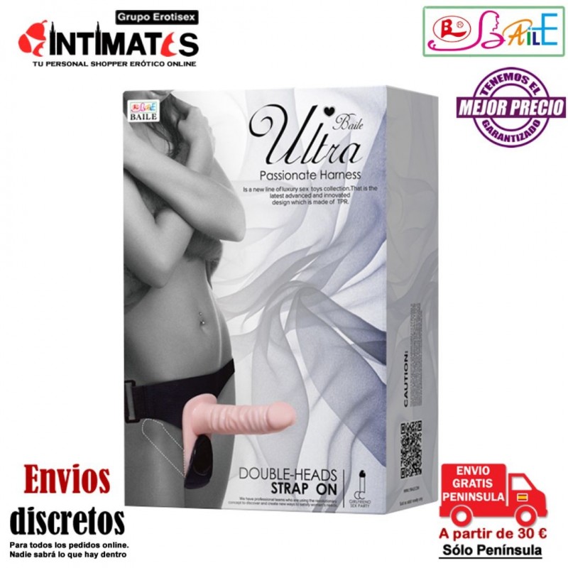 Ultra Passionate Harness Double-Heads es un arnés ajustable para mujeres con un fenomenal pene realístico con vibración y un plug vaginal, fabricados de vinilo de gran calidad.