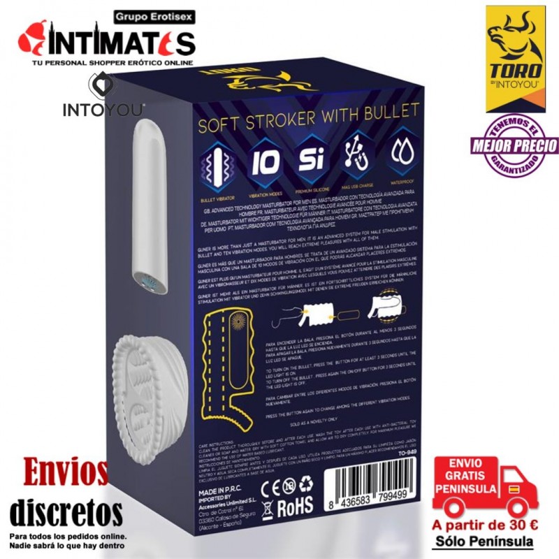 Junto con la manga masturbadora encontrarás una bala vibradora, la cual cuenta con 10 funciones de vibración para que puedas ir probando hasta encontrar la que más se adapta a ti.