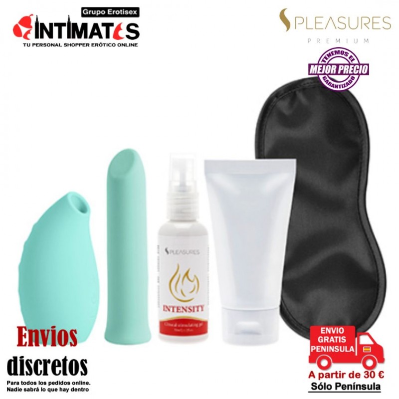 En este pack viene incluido un estimulador de clítoris por ondas de presión, una bala vibradora para zonas erógenas, un lubricante a base de agua, un estimulante con efecto calor para el clítoris y un antifaz.