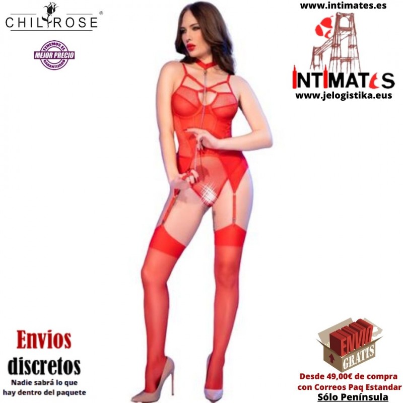 CR-4879 · Body crotchless de malla elástica roja · Chilirose