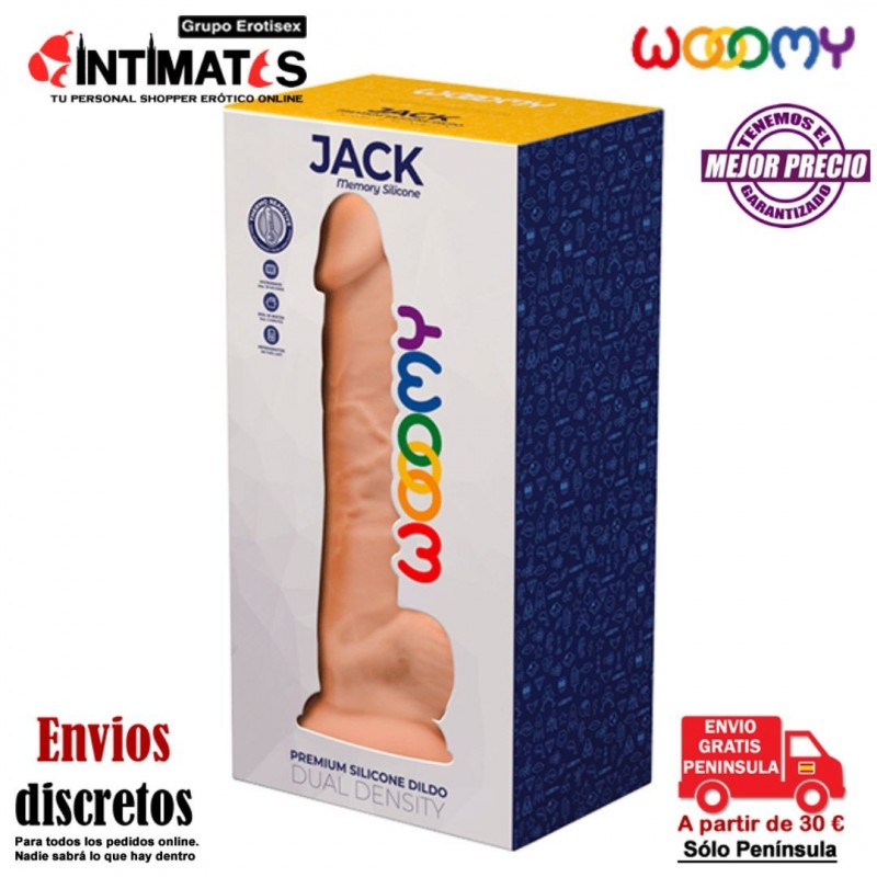 La marca Wooomy presenta Jack, un consolador realista de alta calidad en Silicona Premium de doble densidad, termo reactiva que ofrece diferentes sensaciones cuando se calienta o se enfría.