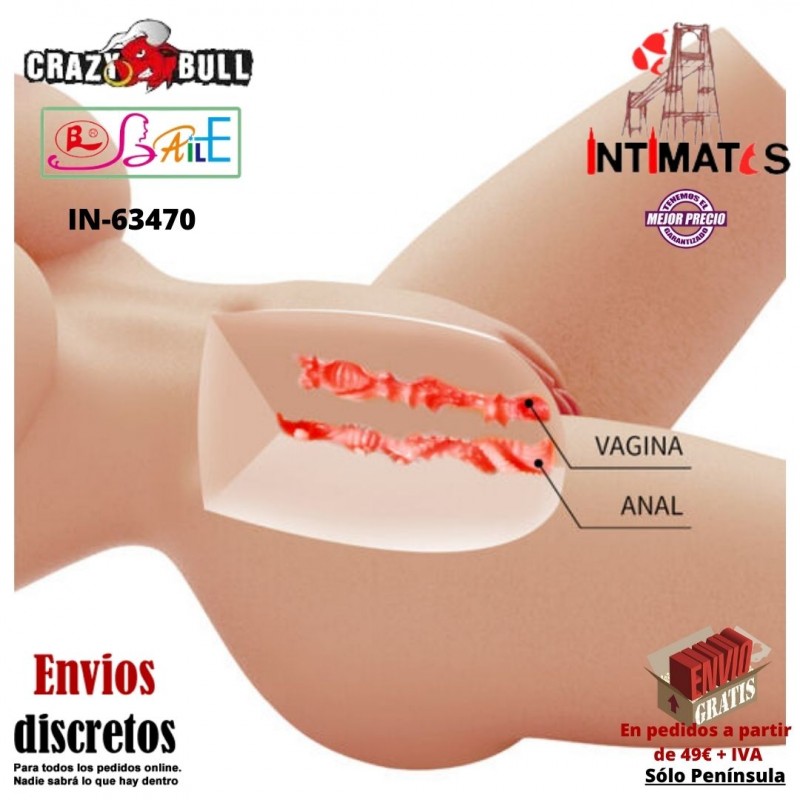Sus dos orificios independientes (vaginal y anal) han sido diseñados anatómicamente para proporcionar una estimulación intensa y realista, con una sensación fisiológica auténtica que imita fielmente la intimidad femenina.