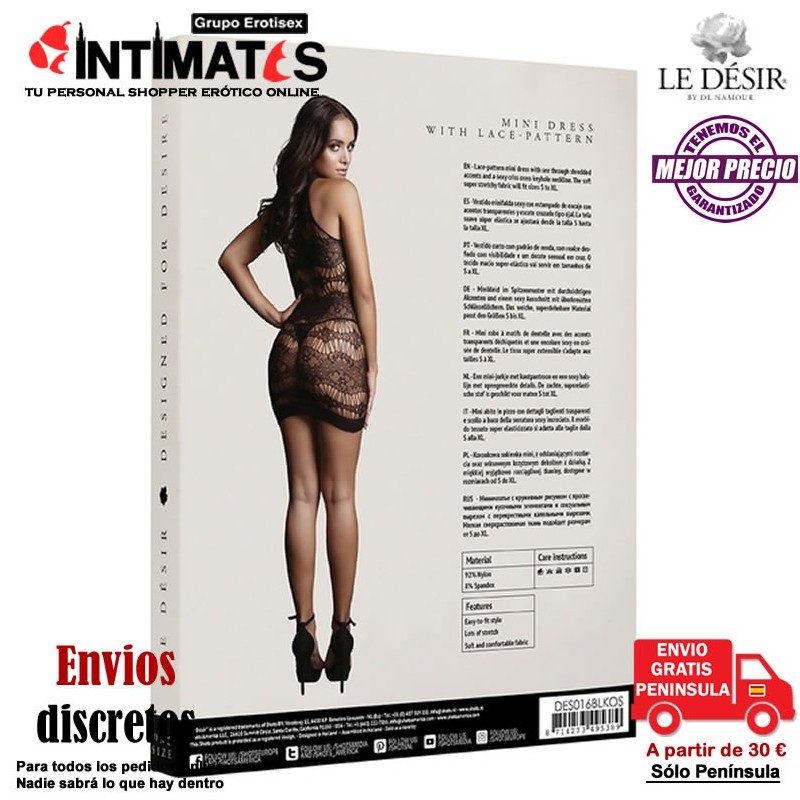 Vestido corto de malla sexy con estampado de encaje, acentos transparentes y escote cruzado tipo ojal.