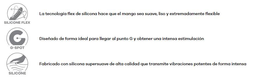 Con su estructura suave de silicona maciza de alta calidad, el vibrador es extremadamente flexible y gracias a la tecnología Flex de silicona, las vibraciones también llegan de forma óptima al punto G.