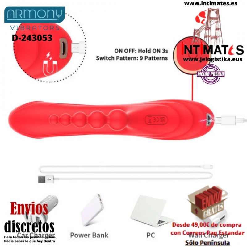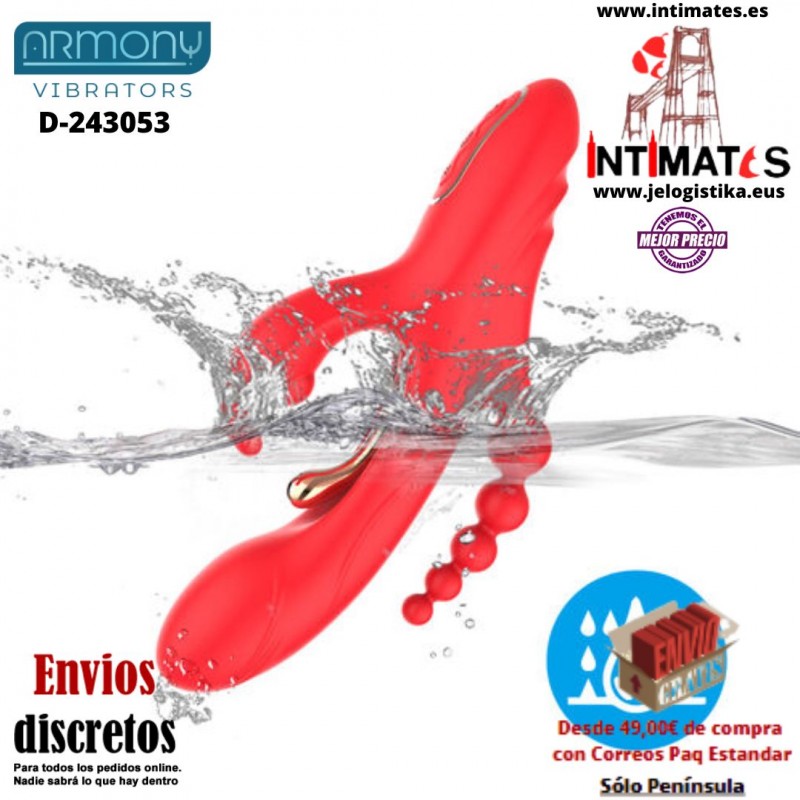 El vibrador Armony es un innovador juguete diseñado para la estimulación simultánea del punto G y el clítoris, proporcionando placer intenso con su doble función de vibración y su tecnología de silicona líquida.